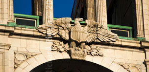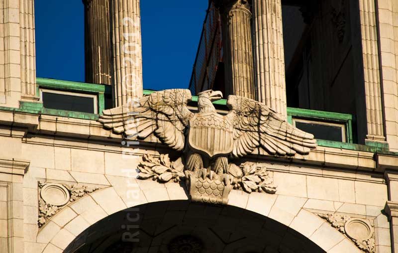 The 21-story neo-classical American Express Company building was constructed between 1916-1917, and was designated a New York landmark in 1995. The H-shaped plan of the building, with two connected tall towers was designed to provide offices with the maximum amount of light and air. Of note is the facade at the 20th and 21st floors on both the Broadway and Trinity Place sides, which has a two-story colonnade bridge supported by an arch with an enormous terra-cotta eagle. And three-stories above the entrance of 65 Broadway there is a wonderfully defiant bronze eagle (the company’s insignia) installed in 1977, astride an anchor and standing in the surf of waves.