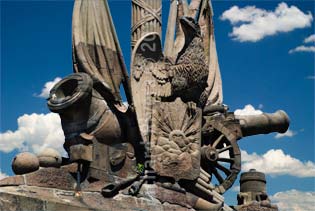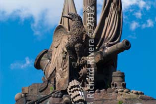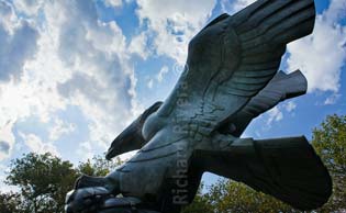 The bronze eagle is approximately 11 feet tall, and sits atop a six-foot high pedestal of polished black granite. It appears to be swooping down but carries olive branches in its talons, the symbol of peace and victory. It was created by sculptor Albino Manca.